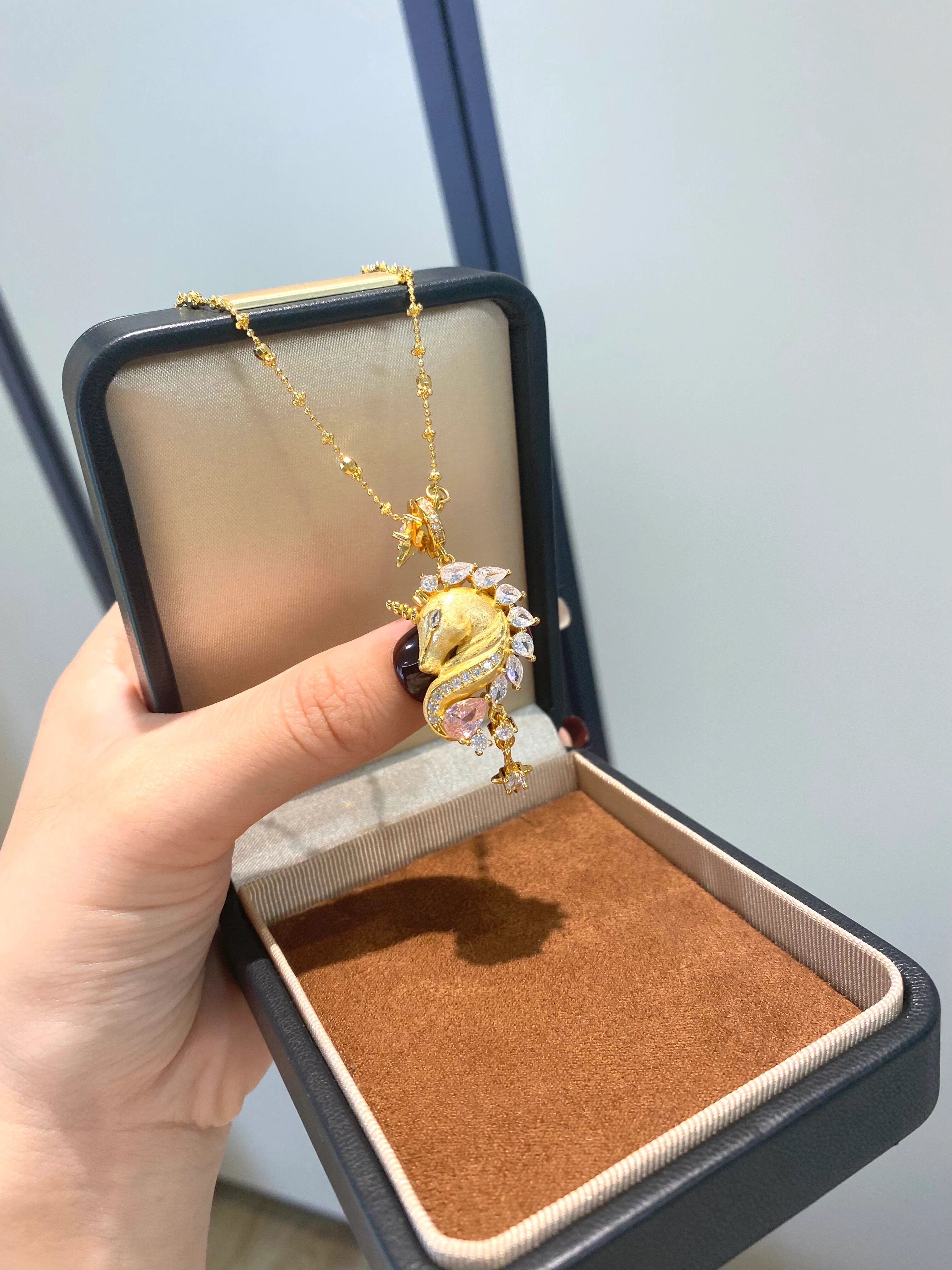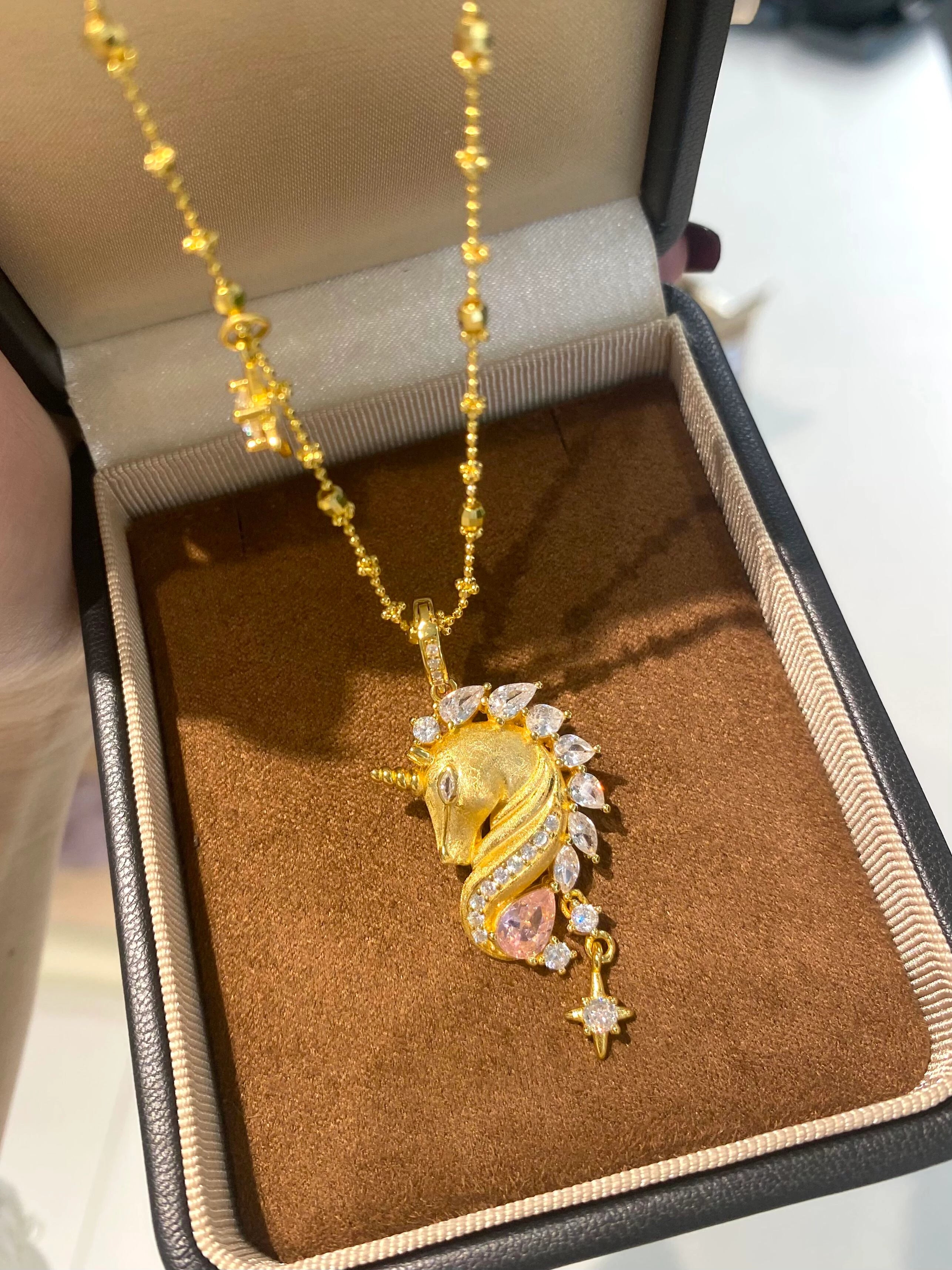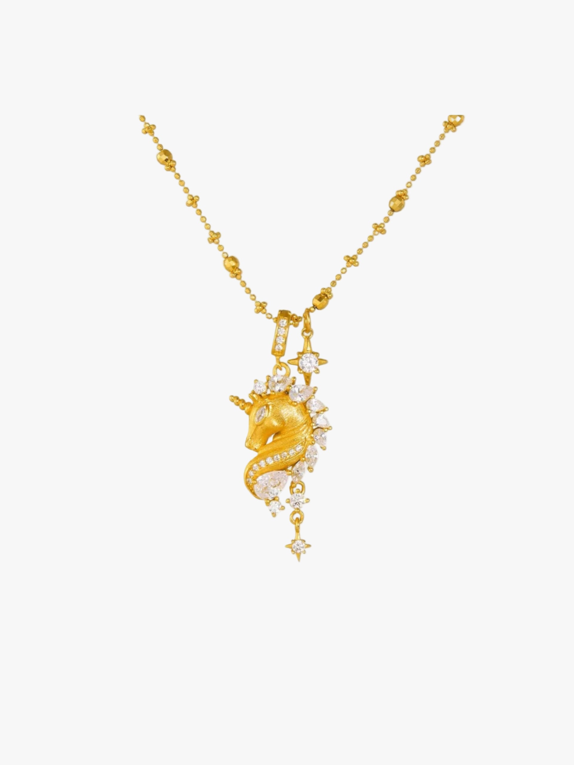 Dreamy unicorn choker necklace in 925 sterling silver with gold plating and a brushed, dimensional finish. The pendant sparkles with CZ accents and starburst charms, paired with a delicate station chain for extra shine. Finished with an adjustable extender for an easy, comfortable fit—wear it as a choker or slightly longer. Perfect for everyday looks and gifting.