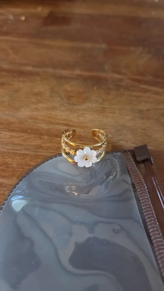 A flower triple band ring with a carved faux shell centre and a polished gold-tone finish. Delicate yet dimensional, it brings soft texture and floral detail to everyday styling.