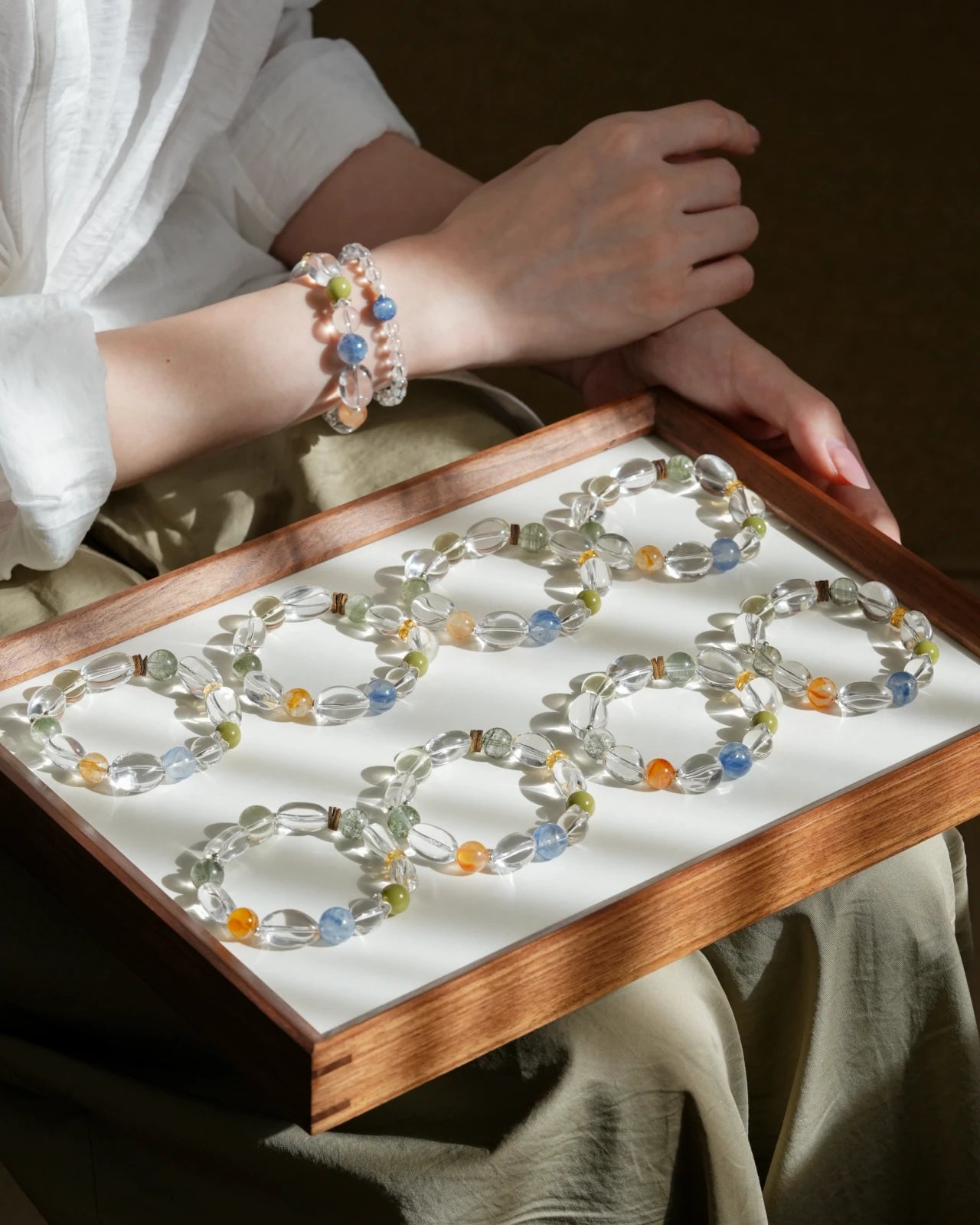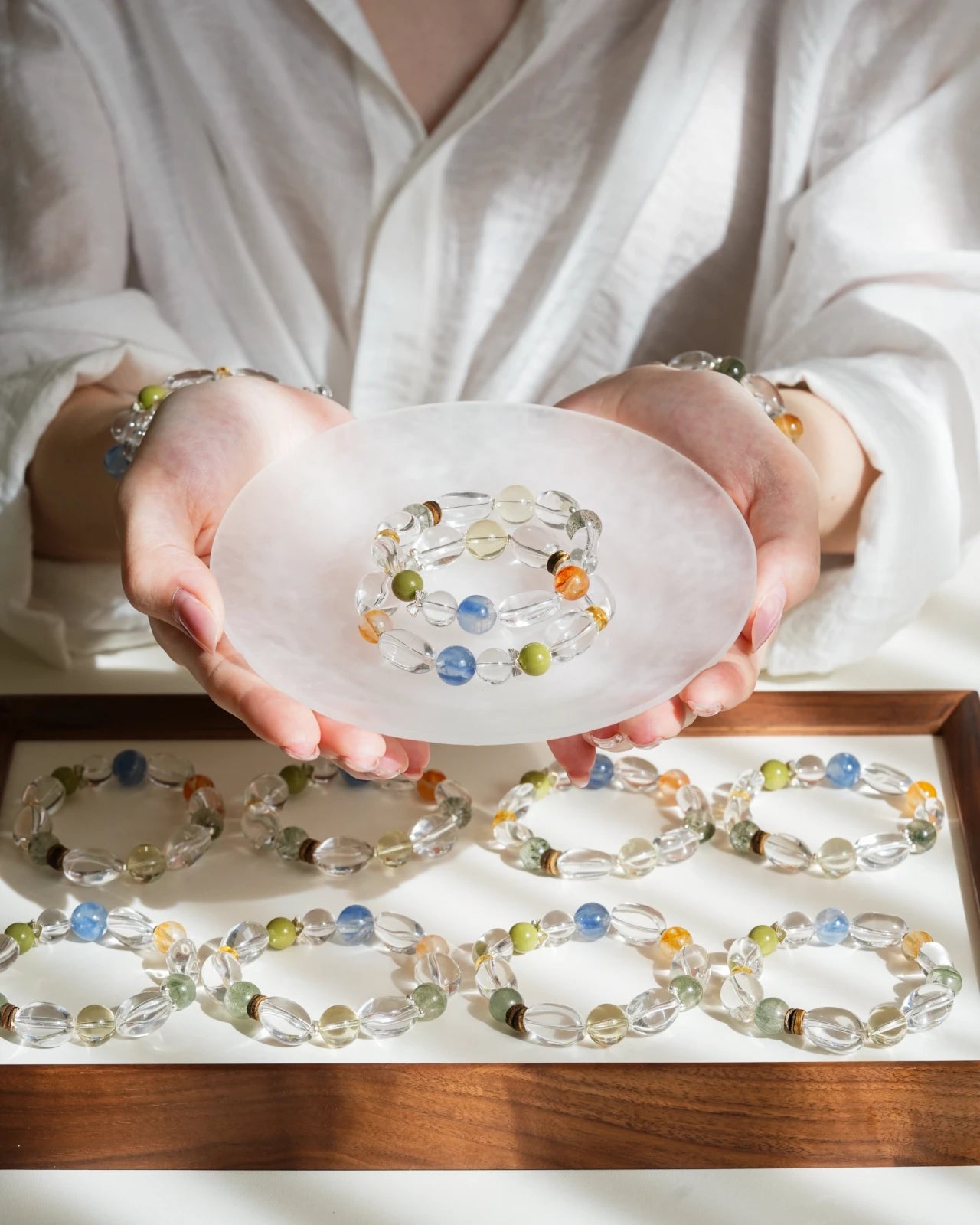 Morning breaks like citrus: lemon quartz lifts mood. Under the canopy, green phantom quartz roots the breath. By late sun, citrine carries easy optimism. Clear quartz holds the center while a quiet chorus—yellow hematoid quartz, Alxa “avocado” agate, kyanite, and agarwood—keeps light and calm in balance.
