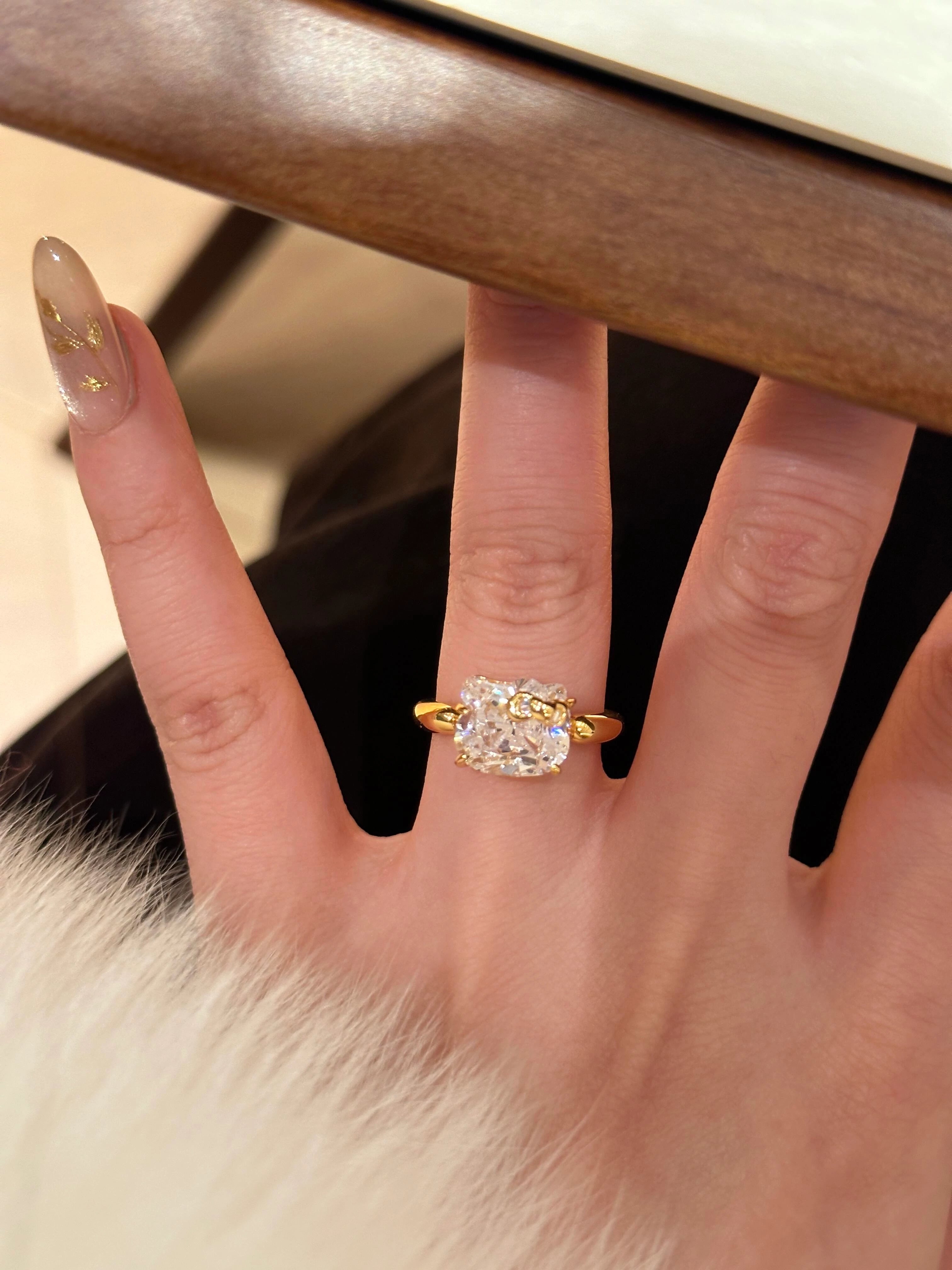 Inspired by a cute kitty silhouette, this ring features an oversized faceted clear cubic zirconia with a tiny gold-tone bow detail on top. Set on a polished gold-plated open band with secure prong setting, it’s easy to adjust for a comfortable fit and works beautifully stacked or worn solo, adding a playful yet refined shine to everyday looks.