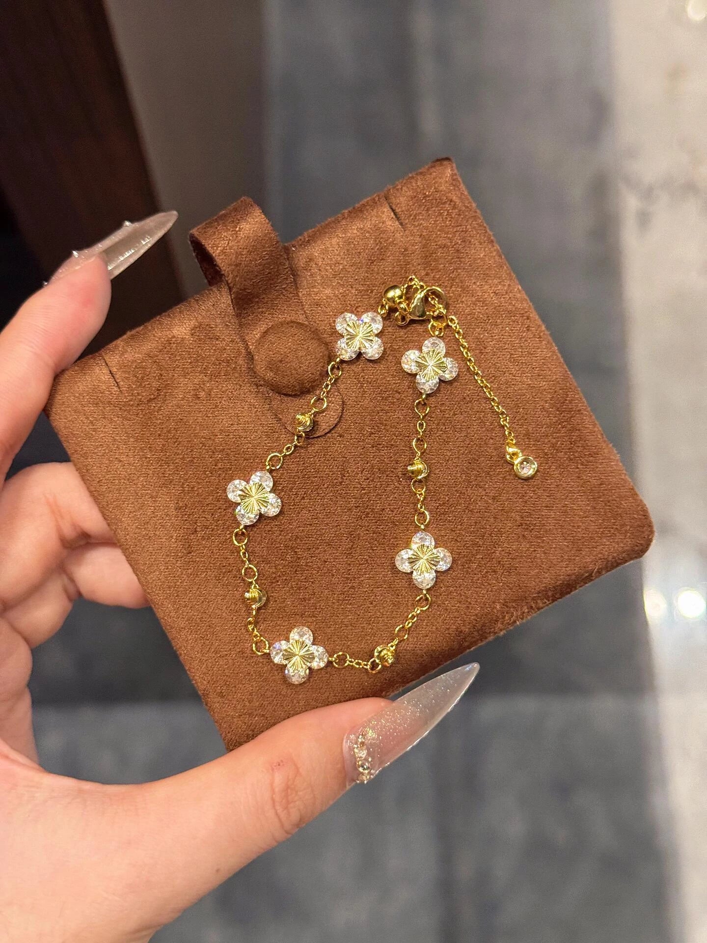 Crafted in 925 sterling silver with gold plating, this bracelet features repeating laser four-leaf clover motifs—a sunburst-engraved gold-tone center framed by round cubic zirconia to form a delicate clover. Finished with small bead links and an adjustable chain tipped with a bezel-set CZ charm, it adds a touch of lucky sparkle to everyday stacks or light-luxe looks.