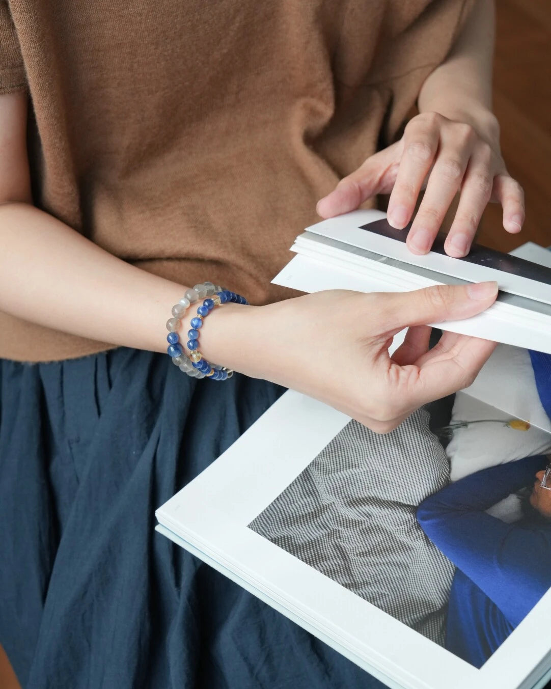 Gray Moonstone settles the pace; kyanite clears the line between thought and voice; pearl lends quiet poise. Three notes, one alignment: softer breath, truer words, composed grace.