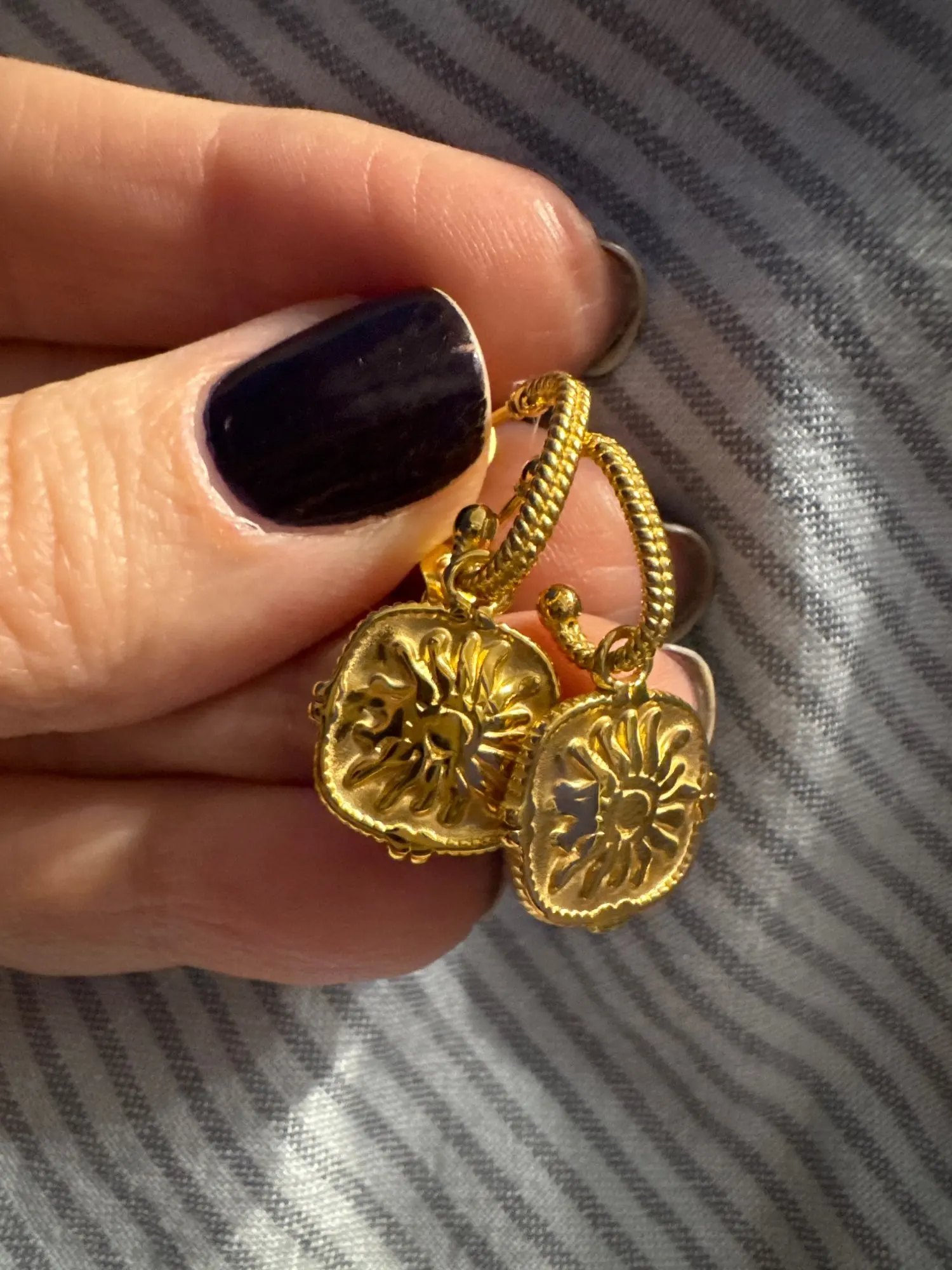 Bring vintage-inspired elegance to your jewelry collection with these beautifully detailed twisted hoop earrings. Designed with textured rope-style C-hoops, each earring suspends a cushion-shaped medallion charm embossed with a radiant sunburst motif and framed by delicate beaded edging.